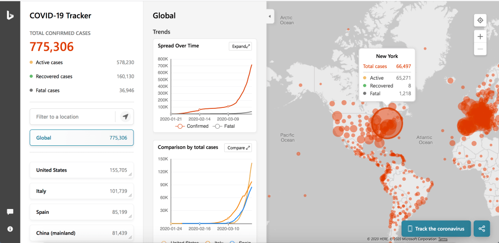 Bing has developed an interactive map in order to keep people up-to-date on COVID-19. The map includes worldwide information about current active cases, recovered cases and fatal cases. By clicking on individual countries, you can see and read breaking news stories relevant to that country.