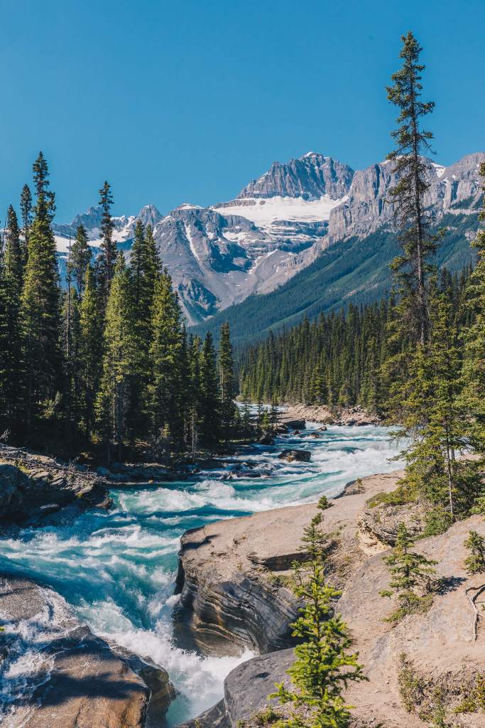 Athabasca Falls is a powerful waterfall located off the Icefields Parkway near Jasper. The waterfall drops 80 feet into a deep canyon and offers stunning views of the rushing water below. There are several hiking trails around the falls, making it a great spot for a family outing.