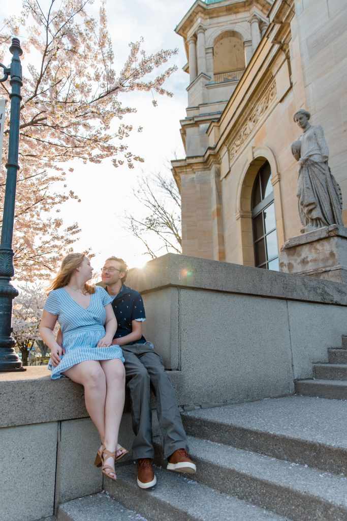 The cherry blossoms were in full bloom and their soft pink petals provided the perfect backdrop for this lovely couple. As they walked hand in hand, laughing and smiling, the trees surrounded them with their ethereal beauty. It was a dream come true for any photographer.